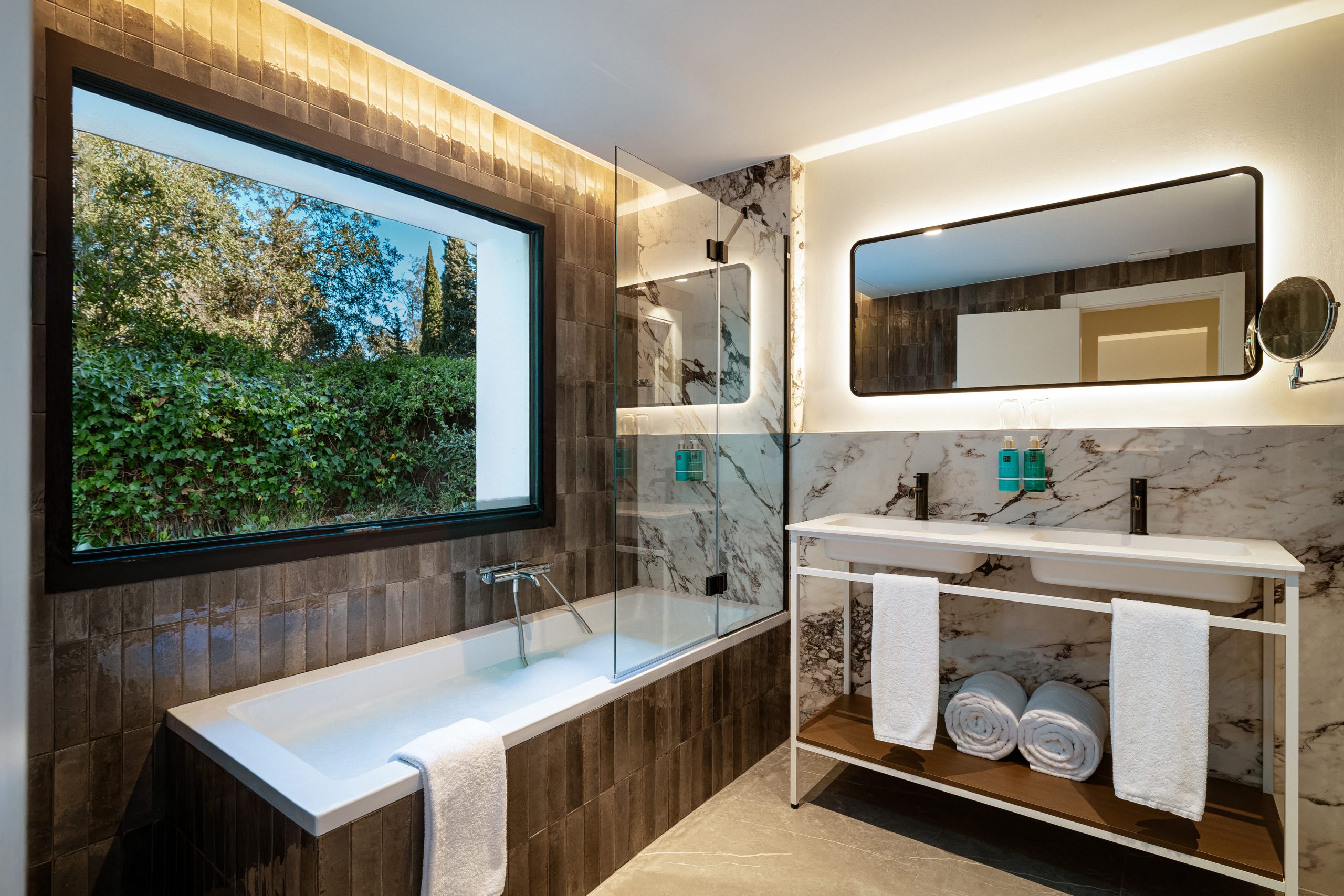 Klimaanlage, Wifi, Anwesenheitssensor für die Nachtbeleuchtung, Nespresso®-Kaffee- und Teezubereitungsmöglichkeiten, Bademantel, Rituals®-Pflegeprodukte, Kissenauswahl im Zimmer (auf Anfrage), Haartrockner, Vergrößerungsspiegel, Minibar, Safe, TV 50" mit Satellitenkanälen, Bügeleisen und Bügelbrett.